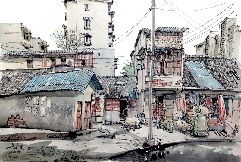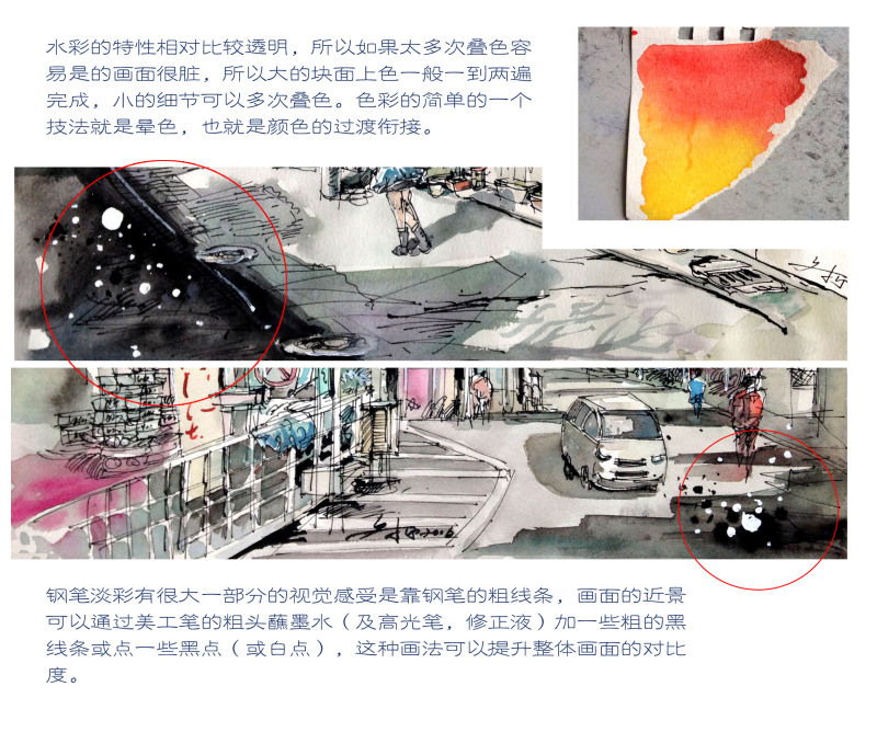 鋼筆淡彩有很大一部分的視覺感受是靠鋼筆的粗線條,畫面的近景可以通過美工筆的粗頭蘸墨水(及高光筆,修正液)加一些粗的黑線條或點(diǎn)一些黑點(diǎn)(或白點(diǎn)),這種畫法可以提升整體畫面的對比度。