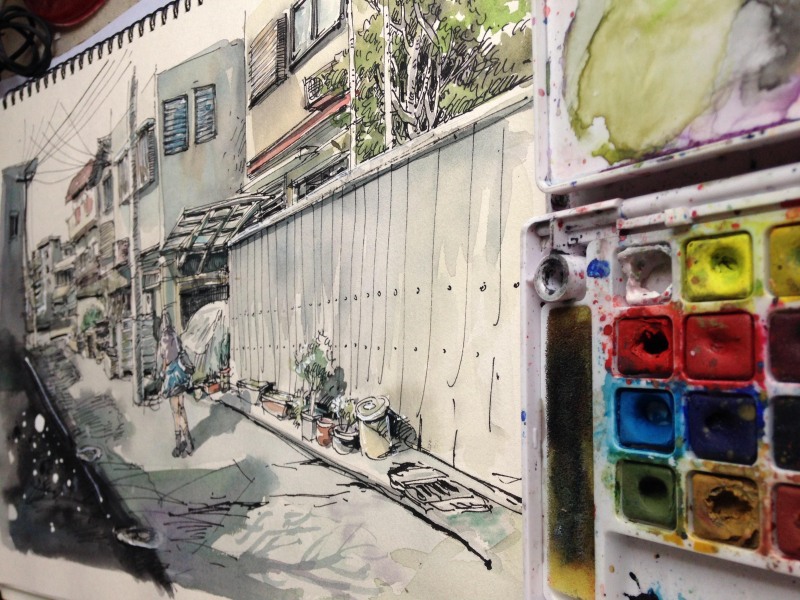 鋼筆淡彩分兩部分,鋼筆線稿及色彩。一般會使用美工筆勾線,水彩來上色。線稿的鋼筆線條要求快速利索,這樣畫面更有張力。