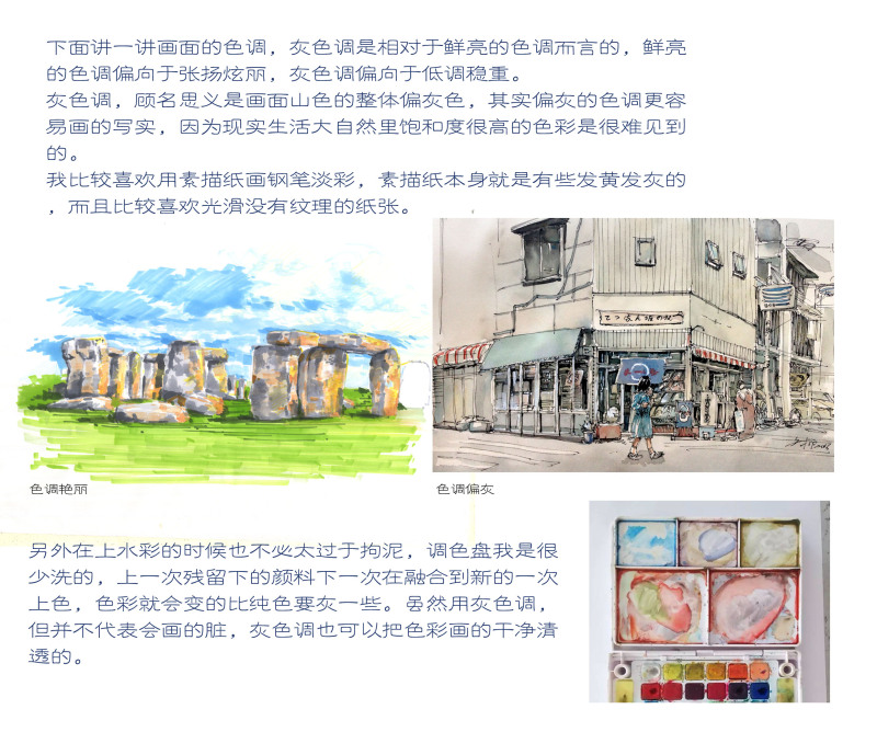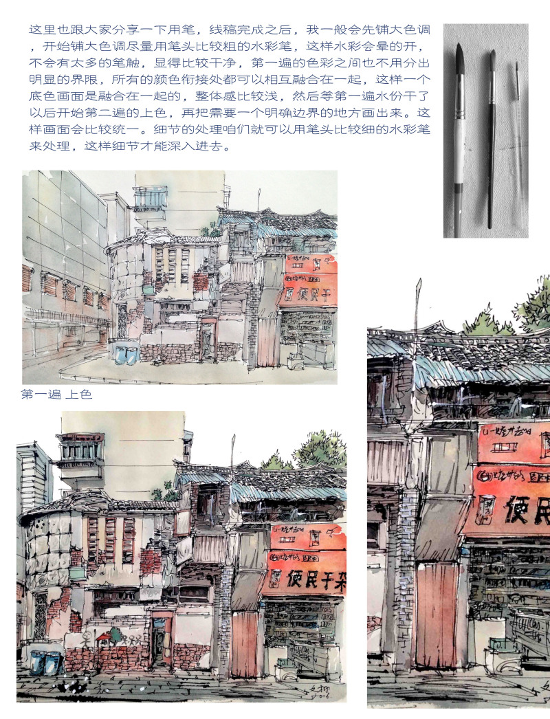 這里主要講一講色彩,鋼筆淡彩不像純水彩,純水彩的技法會更多一些,而鋼筆淡彩的水彩技法相對比較少。鋼筆淡彩的線稿和色彩比重的不同一般可以有兩種畫法: